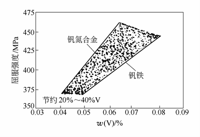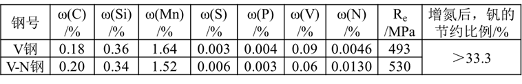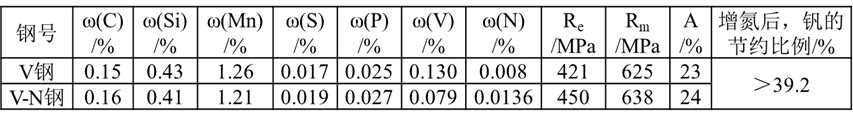 在釩鋼中加入適量的氮,一方面,顯著促進V(C,N)的析出,細化鋼的鐵素體晶粒,提高鋼的強度,改善鋼的塑韌性,使鋼獲得了良好的綜合性能;另一方面,在保證原鋼種強度水平的前提下,在釩鋼中增加適量的氮可減少釩的加入量,對鋼的制造者來說可以產生明顯的經濟效益,降低鋼的生產成本為了說明這個問題,以下舉幾個鋼材品種的實例深入說明增氮帶來的經濟效益。