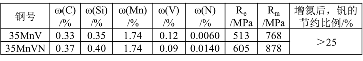 以上結果表明,氮是含釩非調質鋼中一個很有效的合金元素,在保證相同強度水平的情況下,可大大節約釩的加入量,降低鋼的制造成本。2給出了釩鋼中適當增加氮含量對釩含量節約的綜合評價結果,由此可以看出,增氮后釩的節約量波動在20%~40%范圍內。