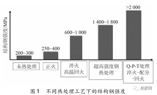 熱處理可以大幅度提高金屬材料的強度。例如結構鋼,工業上很多都是用調質鋼(淬火以后高溫回火),它的強度約為6001000MPa。二戰期間曾經有過一個很大的飛躍,前蘇聯把飛機起落架由調質處理變成淬火以后低溫回火,使它的抗拉強度提高到1600MPa,前蘇聯戰機安裝新的起落架以后,自重減輕,靈活性提高,在技術上領先了德國空軍,從此有超高強度鋼的熱處理誕生。隨后經過持續研究,結構鋼的強度達到1800MPa。近年來,徐祖耀院士帶領他的團隊研究Q-P-T處理(淬火配分回火再強化),使得結構鋼強度提高到2100MPa,比原來調質處理后的強度提高了三倍。最新消息,北京鋼研院正在研究2600MPa鋼種,強度的提高不僅決定于鋼的成分,而且決定于熱處理工藝,從此可以看出熱處理的關鍵作用。