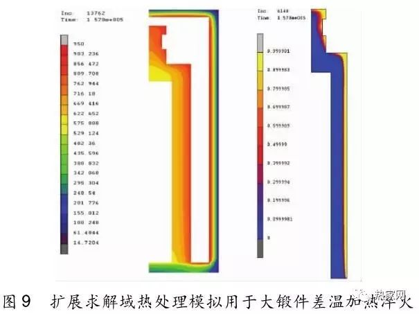另外一個例子,是12500噸鋁型材擠壓機活塞,為了提高耐磨性,要求表面硬度大于50HC。設計部門選取45鋼制造,用45鋼做成那么大的東西,不能淬火怎么辦呢?后來上重廠一起和經過很長時間的考慮采用計算機模擬的方法(見圖9),提出了一個差溫加熱工藝解決了生產上的難題。