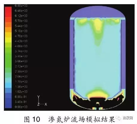 熱處理不僅僅是工藝問題,熱處理設備也很重要。原來一個大型的氮化爐,流場不均勻,而采用計算機模擬的方式改進了旋轉風葉,邊上加了導流板,上面加了分流板,這樣模擬出來流場,工作區域是均勻的(見圖10)