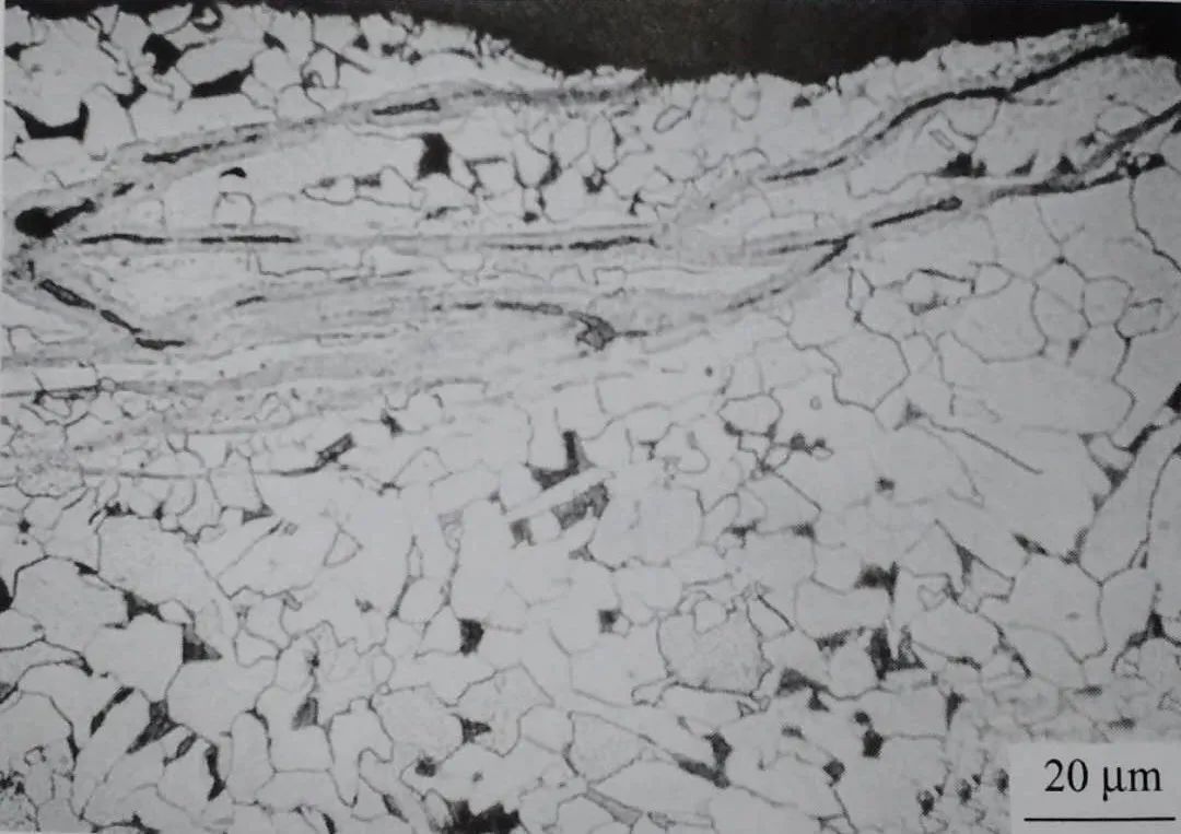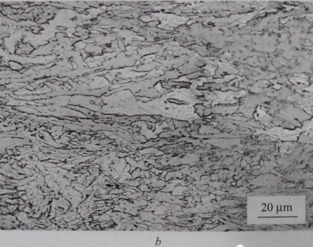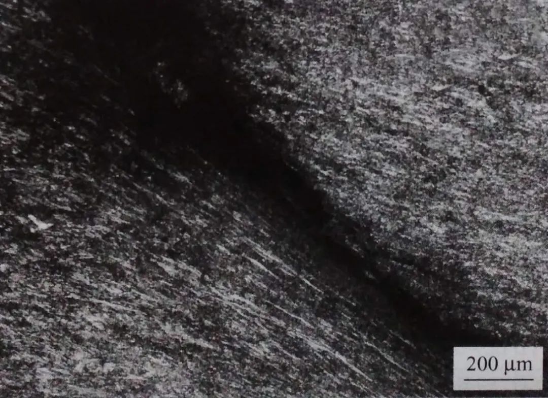 某些進入鋼基較深的裂紋,在裂紋的開口部位(裂口起始部位)兩側組織相同,均為上述淬火馬氏體經高溫回火后的組織。而裂紋延伸進入“過渡區”的部位,尤其是靠近裂紋尾部,裂紋兩側組織差別頗大。裂紋靠近上表層一側,組織不流變(或很小流變), 而靠近鋼基內部的一側,組織明顯流變,貝氏體板條沿鋼基流變方向分布,見圖1-45。裂紋兩側的組織差異正是不同類型的組織隨裂紋形變后的結果。