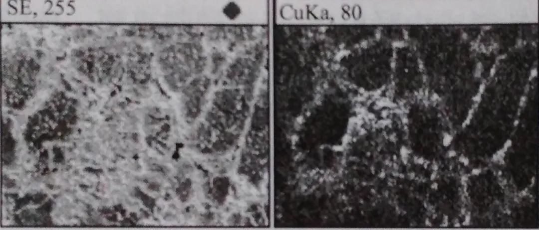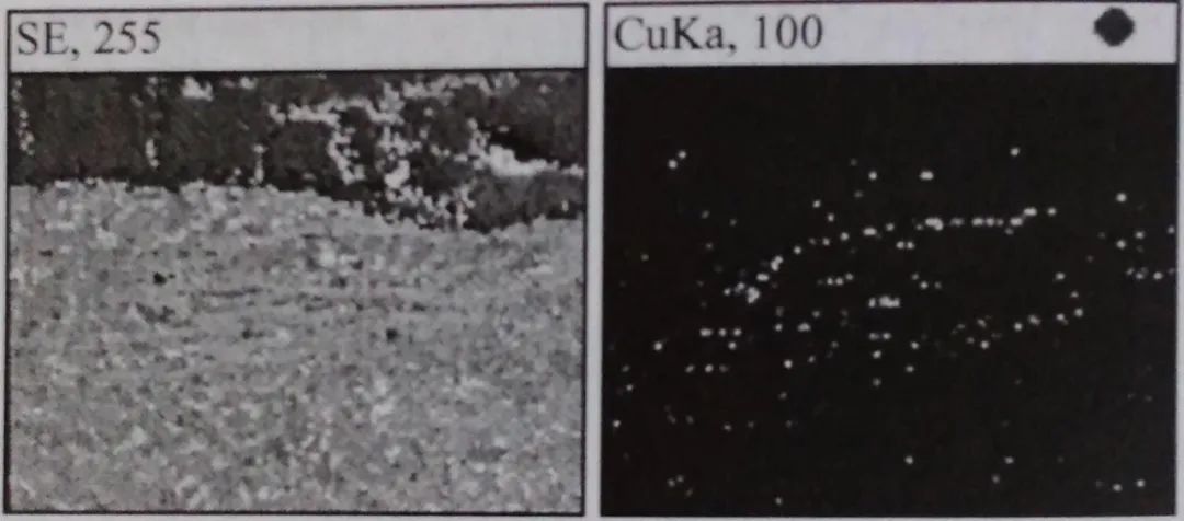用電子探針對上述試樣上的棕黃色富集相進行成分(質量分數,%) 分析,富集相含有銅元素,定量分析點中w (Cu) 為2. 00%~44. 26%, 而鋼板正常部位分析點中卻無銅元素的聚集,銅元素分布特征見圖1-5和圖1-6。