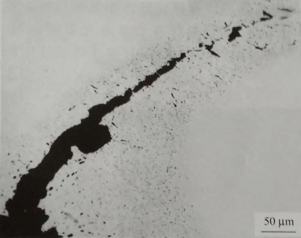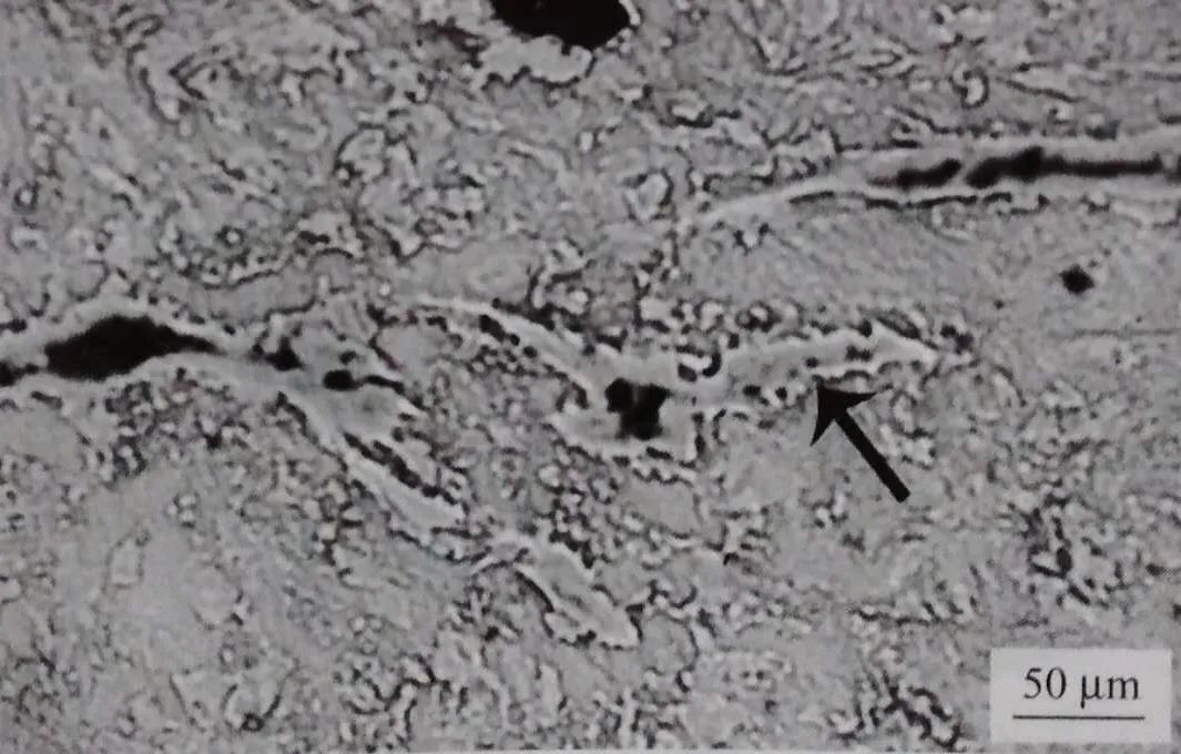 淺磨板面后觀察,裂紋附近有明顯的高溫氧化特征。試樣經硝酸酒精試劑浸蝕后,調動顯微鏡焦距可觀察到裂紋附近有一種灰白色浮凸相(圖1-9 ) 。