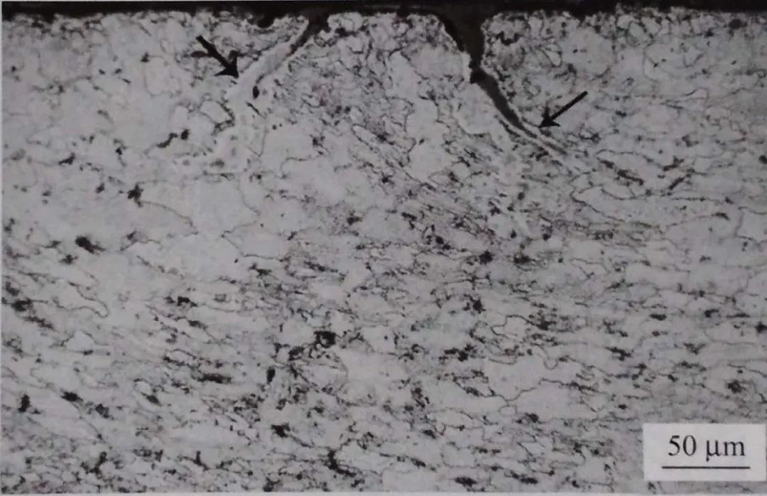 裂紋在鋼板縱截面表層呈雙條對稱分布、附近無高溫氧化特征,見圖1-39。