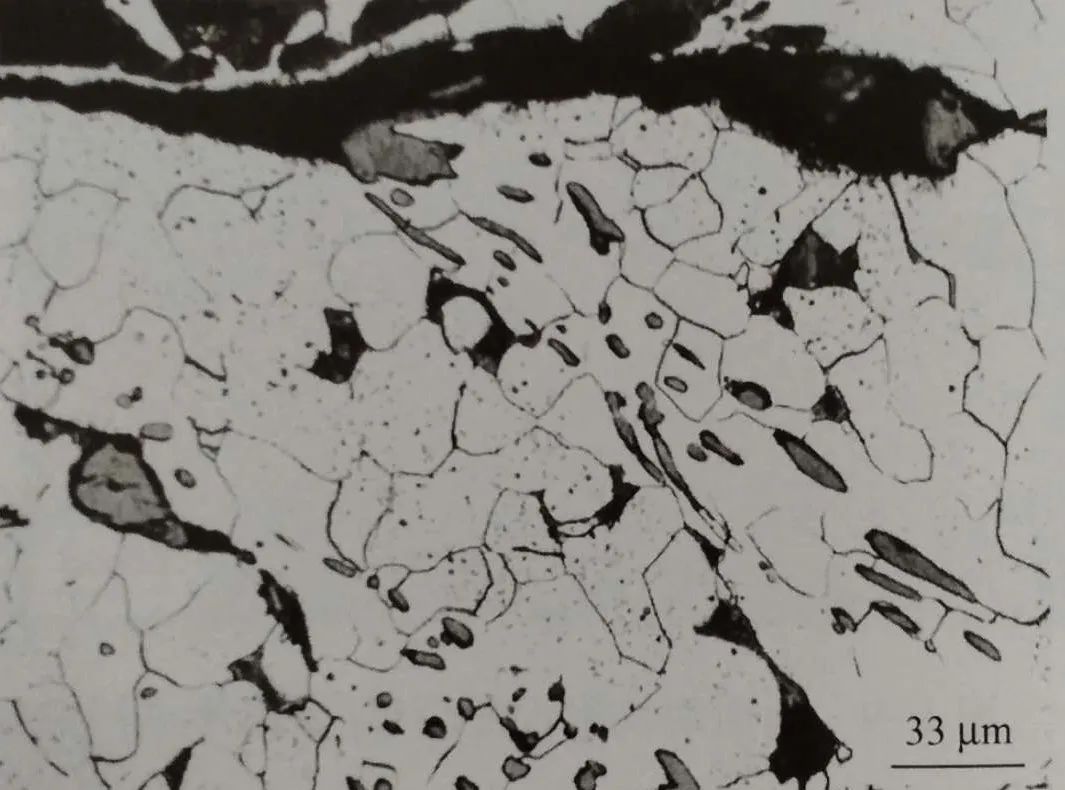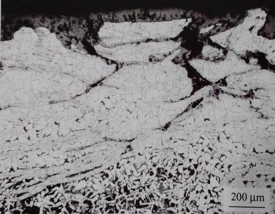 沿板厚方向取縱截面金相試樣觀察,裂紋內嵌有氧化鐵,附近有一些氧化網絡,它們在截面表層具有沿變形最大方向壓扁的網絡狀特征,裂紋附近組織脫碳,部分區域組織呈魏氏形態,見圖1-33。