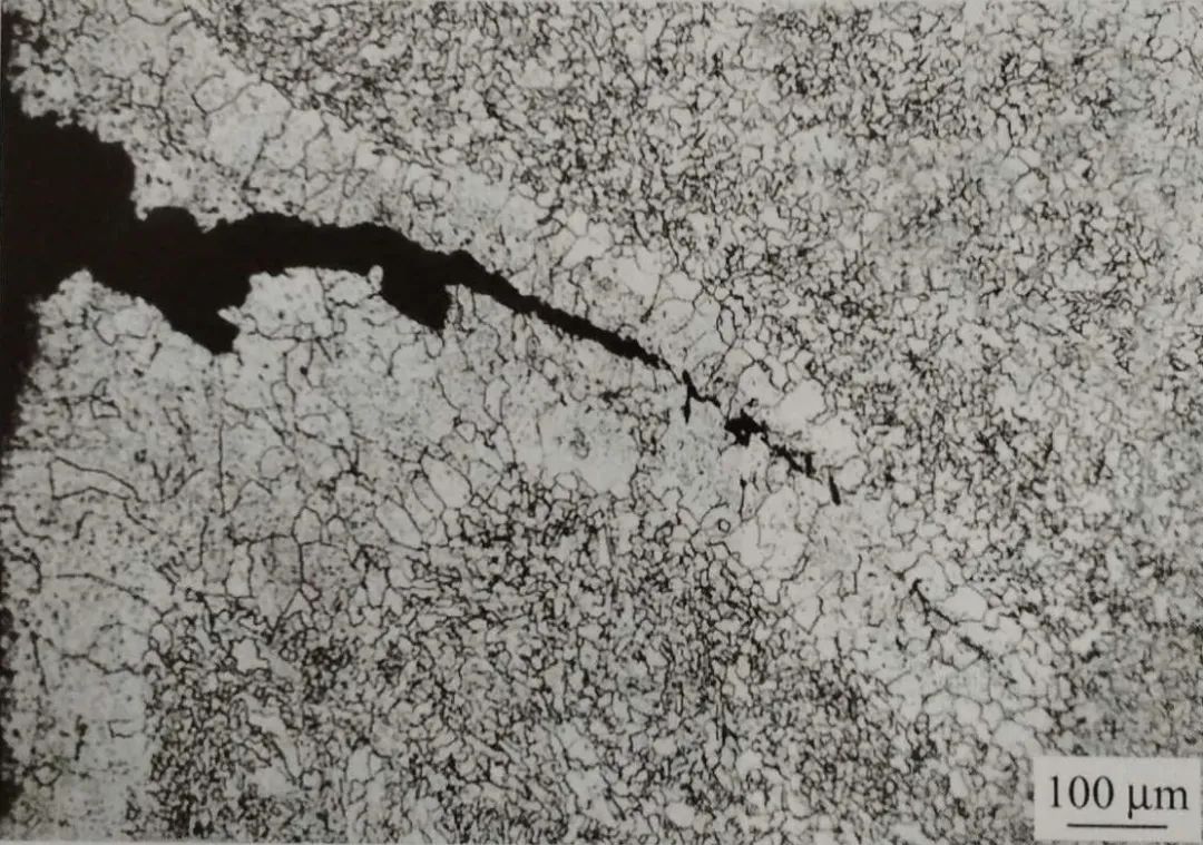 沿板厚方向取截面金相試樣觀察,裂紋根部粗,尾端細,由表面向內深入鋼基,附近及其尾部延伸處有大量密集分布的氧化圓點,且伴有組織脫碳,見圖1-23和圖1-24 。