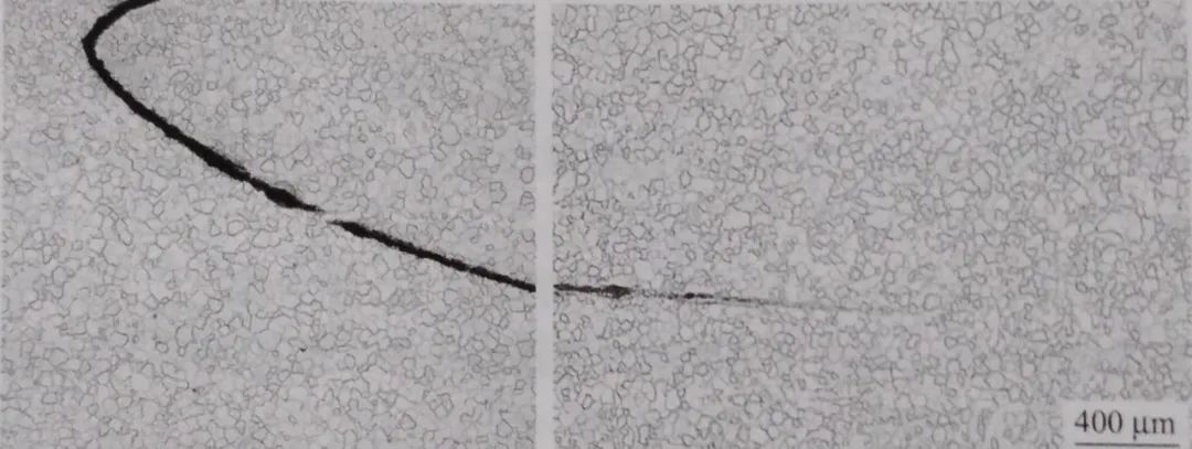 經試劑浸蝕后,試樣正常部位組織為鐵素體和少量三次滲碳體、晶粒度為10級,裂紋兩側的晶粒存在差異,一側晶粒較細,晶粒度為11級:另一側晶粒與正常部位基本相同、晶粒度為9. 5級,見圖1-40。