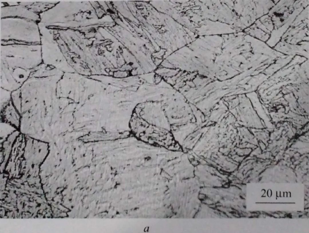 磨制縱截面金相試樣觀察,裂紋較平直,多呈單條狀沿表面斜向深入鋼基,見圖1-43。圖1-42所示的外表層顏色較淺區域的顯微組織為馬氏體經高溫回火的回火索氏體(圖1-44a) 。從組織形貌上可以看出,該區原奧氏體晶粒粗大且多呈等軸狀,少數晶粒有變形但變形度很小,這表明其淬火組織是由奧氏體高溫區(再結晶區)相變而來;次表層顏色較深區域的組織為貝氏體與回火索氏體,原奧氏體晶粒輪廓紊亂,見圖1-44b; 其余正常部位(含鋼板下表層)的組織為板條貝氏體,原奧氏體晶粒形變后被壓扁、伸長,明顯地表現出奧氏體低溫區(非再結晶區)軋制后的相變特征,見圖1-44c。