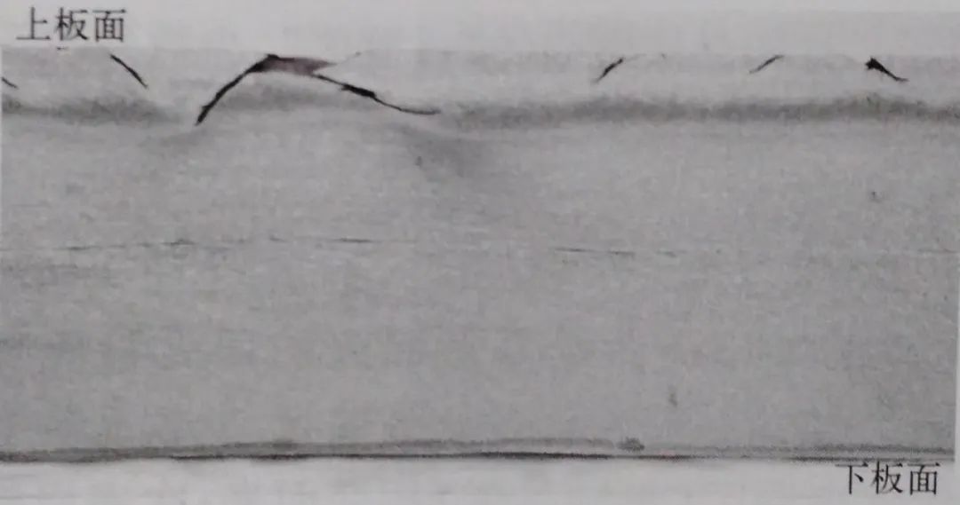 在鋼板的縱截面上,磨面經酸浸蝕后,有裂紋的上表層呈現出顏色不同的三個區域,如圖1-42所示。外表層顏色較淺,裂紋基本位于該區域內,多數裂紋呈單條斜向深入板厚,部分呈雙條對稱的“喇叭狀”開口;次表層顏色較深,猶如受熱影響的“過渡區”, 少數裂紋深入該區;其余部位為正常區,顏色有別于上述兩區。鋼板的下表層顏色與正常區域相同。
