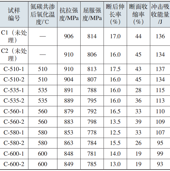 據國外文獻報道,離子氮碳共滲后氧化處理的前提條件是離子氮碳共滲處理后要有較厚的化合物層,這樣才能在后氧化處理過程中獲得致密的Fe3O4層,達到耐蝕目的。氮碳共滲后氧化常用溫度一般不低于560℃,對于高強度工件,采用氮碳共滲后氧化工藝存在降低材料原有強度的可能,因而有必要研究氮碳共滲后氧化對常用鋼力學性能的影響。
