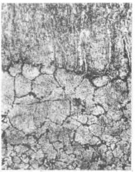 圖1:上部為焊縫區(qū),顯微組織為馬氏體、貝氏體、托氏體和少量柱狀鐵素體;下部為熱影響區(qū)的過熱形貌:馬氏體、貝氏體、托氏體和極少量鐵素體,黑色托氏體沿晶分布。