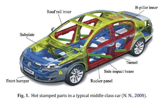 鑒于汽車的輕量化,安全化和抗沖擊性能,對于高強度汽車機構(gòu)鋼板的需求日益明顯。瑞典公司熱沖壓專利及其發(fā)展(1977年專利),被用于一些刀具刃上。1984年Saab汽車公司是第一家采用硬化硼鋼板制作了Saab9000的汽車制造商。生產(chǎn)的零部件從1987年的的300萬件/年到1977年的800萬件/年。自從2000年起,更多的熱沖壓零部件被用于汽車上,并且年生產(chǎn)量在2007年已達(dá)到1億多件。熱沖壓件在汽車工業(yè)的應(yīng)用比如說汽車底盤,像A柱,B柱,保險杠,車頂縱梁和管道,如圖1。