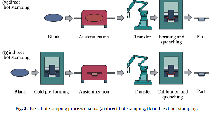目前熱沖壓存在兩種途徑:直接和間接熱沖壓方法。在直接熱沖壓中,半成品被加熱,再轉(zhuǎn)移到?jīng)_壓,隨后在閉式模具內(nèi)成型和淬火。見圖2a。