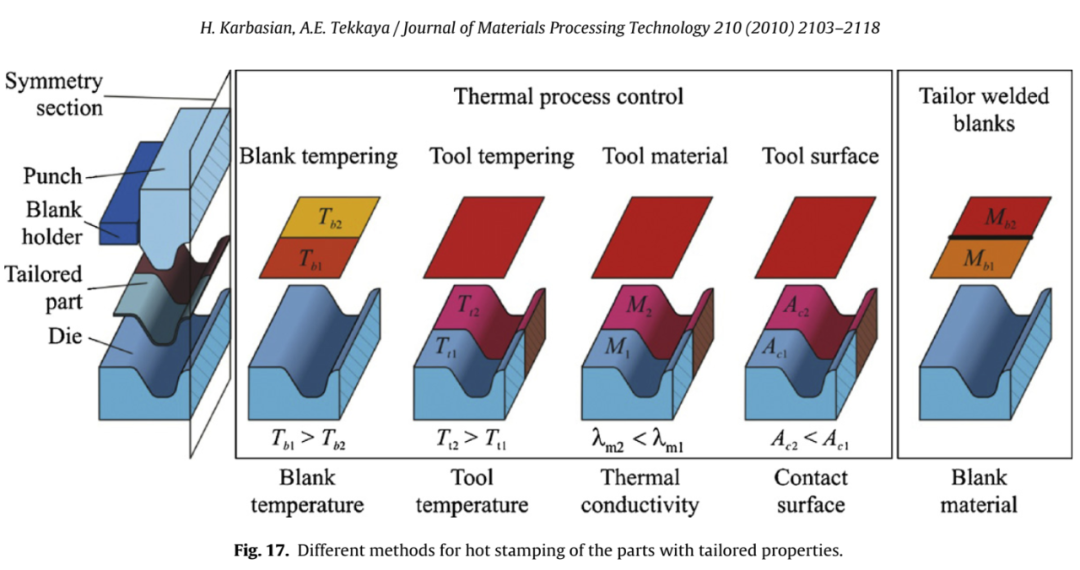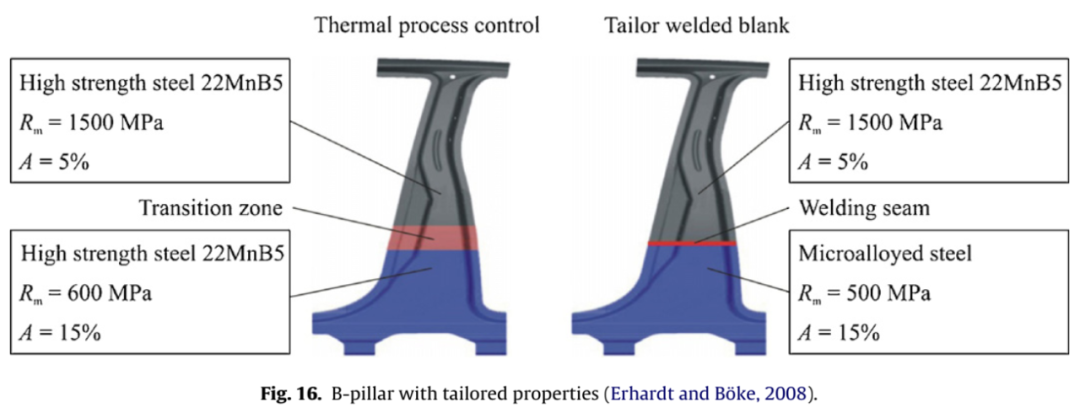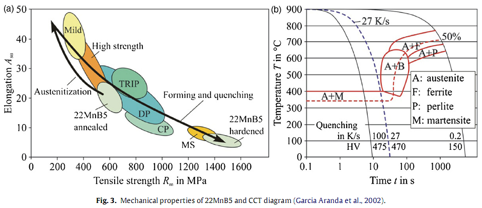 換句話說,熱工序會受到冷卻速率的影響,冷卻速率低于27K/s時可以避免完全馬氏體組織,或者降低回火溫度至Ac3溫以下,這都能導(dǎo)致不完全的奧氏體組織。兩種方法都含有較低的強度而因此獲得高的延展性。其它區(qū)域按通常的沖壓硬化時間-溫度圖來淬火(Stohr et al., 2009)。