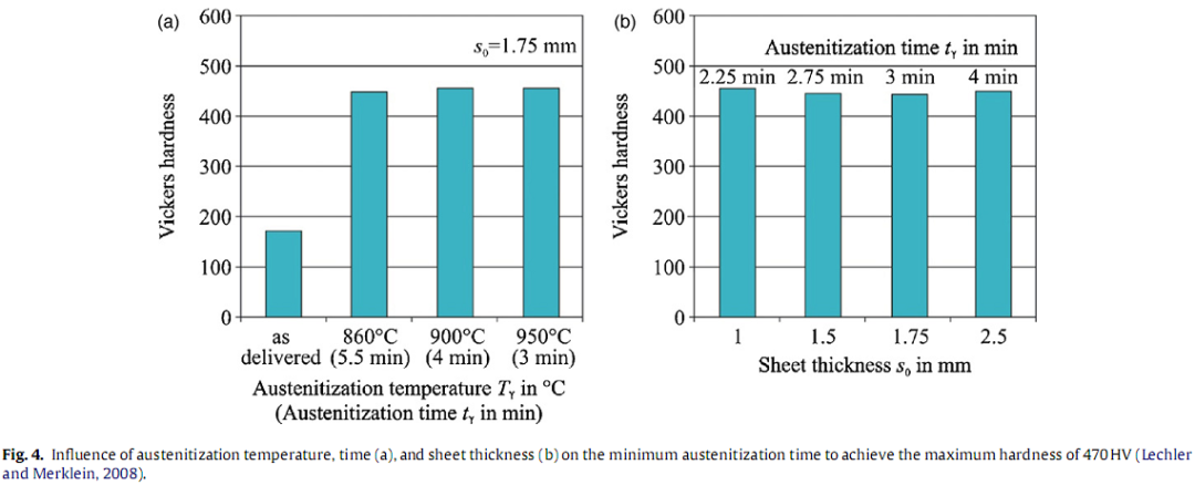 研究結(jié)果顯示可淬火的22MnB5,其同等的奧氏體化程度最短熱處理時間的關(guān)鍵因素是奧氏體化溫度圖4a和鋼板厚度圖4b,。研究發(fā)現(xiàn),在爐溫為950℃下持續(xù)3min有利于獲得最大馬氏體含量,也是最大硬度約為470HV。隨著爐溫的下降,奧氏體化持續(xù)時間增加。在熱處理時隨著確定熱沖壓零部件足夠精確的焊接性能(Stopp et al.,2007),Al–Si涂層的上限時間取決于三元合金Al–Si–Fe層的厚度(Austerhoff and Rostek, 2002)。根據(jù)實驗(Stopp etal., 2007),在爐中不超過奧氏體化時覆層厚度大約為40um。