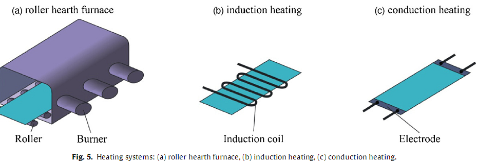 Lechler (2009)的研究中列出了鋼板熱處理工藝對零部件性能,處理時間,熱沖壓成本效率有著深遠(yuǎn)的影響。因此,均勻的坯料溫度和較短的加熱時間是加熱系統(tǒng)的主要要求。鋼板可以通過不同的加熱系統(tǒng):加熱爐,電磁感應(yīng),和熱傳導(dǎo)(圖5)。