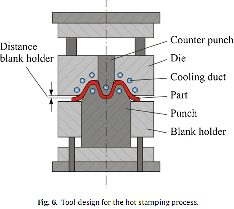 為了避免在成形前工件的冷卻,工件必須盡快在爐中沖壓成型。而且,成型必須在馬氏體相變之前完成。所有,迅速的閉模盒和成型工序是熱沖壓成功的關(guān)鍵。在成形之后,工件在封閉模內(nèi)淬火,冷卻系統(tǒng)是通過導(dǎo)管內(nèi)的冷卻水來將熱量帶走。為了避免在成形過程中,沖模和工件加劇之間部分的淬火,通常在熱沖壓系統(tǒng)中留一段空的距離(見圖6)。