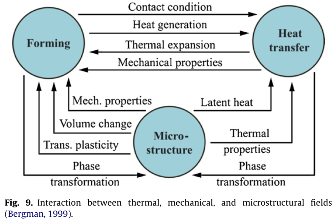 熱沖壓成形是一個預(yù)定相轉(zhuǎn)變的熱機械成形工藝。取決于歷史溫度,機械變形,不同相和混合相的交互作用。熱釋放時固態(tài)相轉(zhuǎn)變的過程會影響熱場。此外,隨著微觀成分的不同,機械性能和熱性能都會根據(jù)溫度和變形的不同而變化。因此,一個可行的的有限元仿真模擬必須考慮機械,熱,和微觀組織的交互作用(見圖9)。這需要過程特性,例如熱轉(zhuǎn)變系數(shù),材料的流變行為,和相關(guān)條件下的相轉(zhuǎn)變。由于在過程模擬中傳遞了微觀結(jié)構(gòu)演變數(shù)據(jù),因此可以對最終屬性(例如硬度和拉伸強度)進行適當(dāng)模擬。