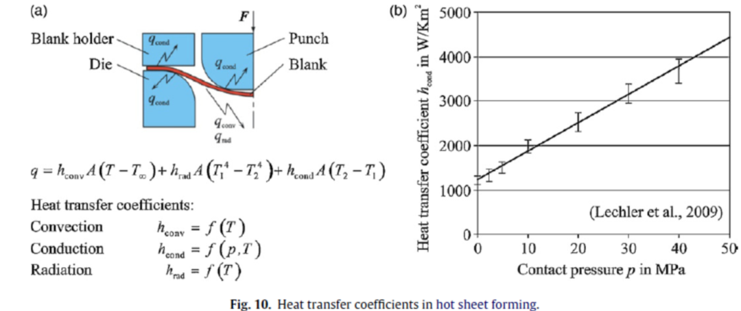 有限元模擬方法對熱沖壓件的力學(xué)性能的預(yù)測,需要對形成和淬火中的熱現(xiàn)象建立精確的模型。傳熱系數(shù)h影響整個成形過程中的冷卻和熱行為。并且受接觸壓力和鋼板的溫度以及表面狀況的影響(規(guī)模厚度,表面粗糙度,涂層厚度等)(Forstner等,2007)。作為基礎(chǔ)材料22MnB5的力學(xué)性能強烈依賴于溫度,這是最重要的參數(shù)之一,是有限元建模熱輔助成形必須考慮的因素。