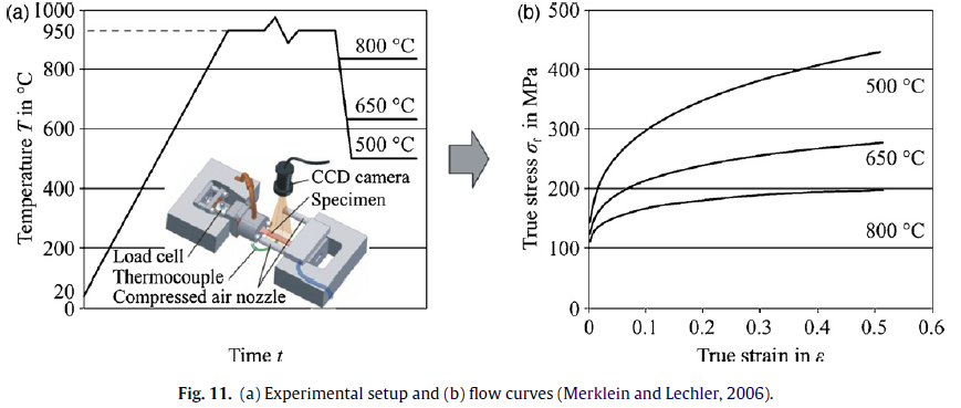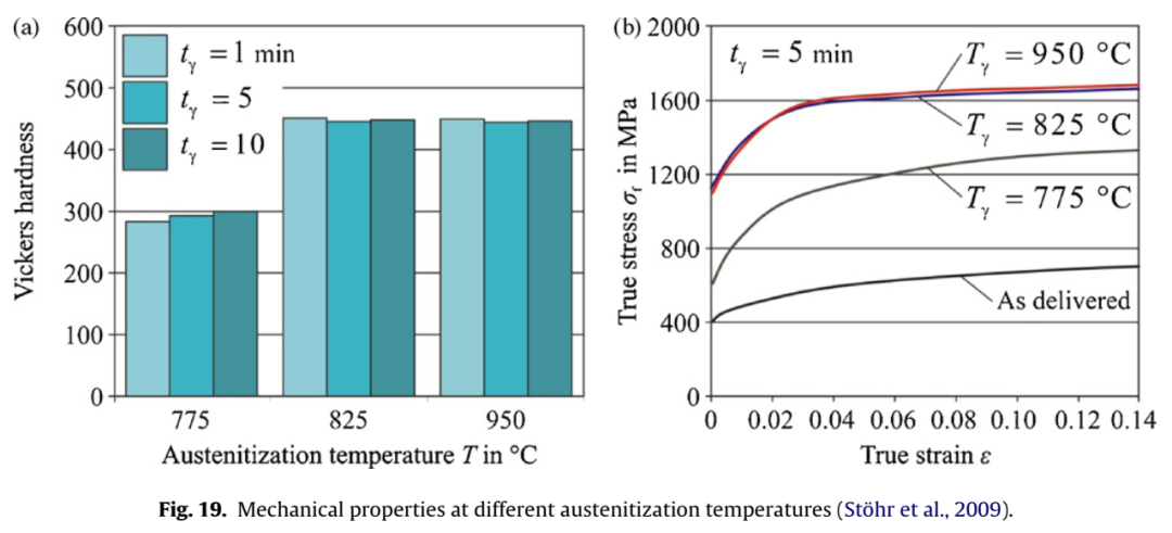 實驗數(shù)據(jù)與材料模型的對比現(xiàn)實,在奧氏體化條件下對22MnB5流變行為的模型模擬是可能的。持續(xù)的流變行為必須考慮材料的熱-機械性能,得基于相變潛熱,體積變化,相轉(zhuǎn)變后馬氏體的塑性等條件。此外,在高溫下鋼的可formability成形性可以通過適當(dāng)?shù)氖?zhǔn)則來獲取,比如建立應(yīng)變,應(yīng)變速率,溫度,和組織演變的函數(shù)關(guān)系。