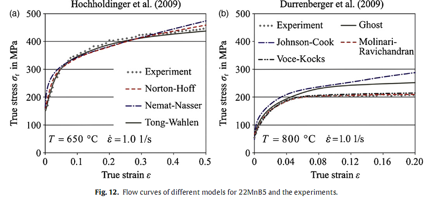 對于熱機械加工工藝,已經(jīng)提出了各種半經(jīng)驗以及基于物理的流動應(yīng)力模型。表3中的現(xiàn)有模型來自最近的出版物,顯示22MnB5有良好的流動性能,與Hochholdinger等人(2009年)和Durrenberger(2009年)的實驗數(shù)據(jù)相符。流變應(yīng)力的測定實驗數(shù)據(jù),通過墩粗測試獲得,它是在一個高速膨脹變形計中進行(Hochholdinger等,2009)。表3中某些材料模型的參數(shù)估算未在引用的參考文獻中公布。但像Johnson–Cook和Norton–Hoff這樣的其他材料數(shù)據(jù)也可以在?kerstr?m(2006)和Lechler(2009)那里找到。