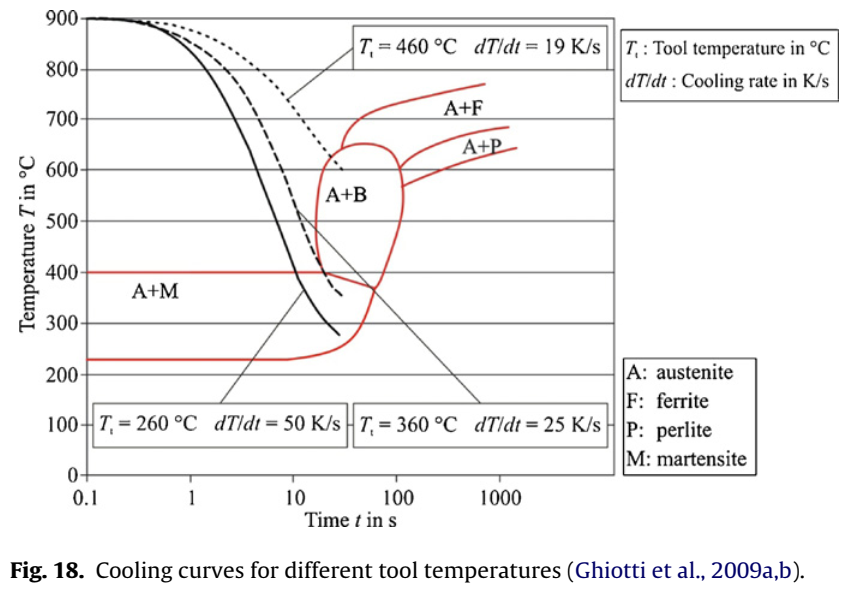 在持續(xù)冷卻工序中,冷卻速率和硬度是相關(guān)的參數(shù)。在實際的操作中,ErhardtandBoke(2008)用的冷卻速率用于熱沖壓模擬中,以確定硬度值和其他的機械性能。機械性能依賴于熱和成形的歷史。