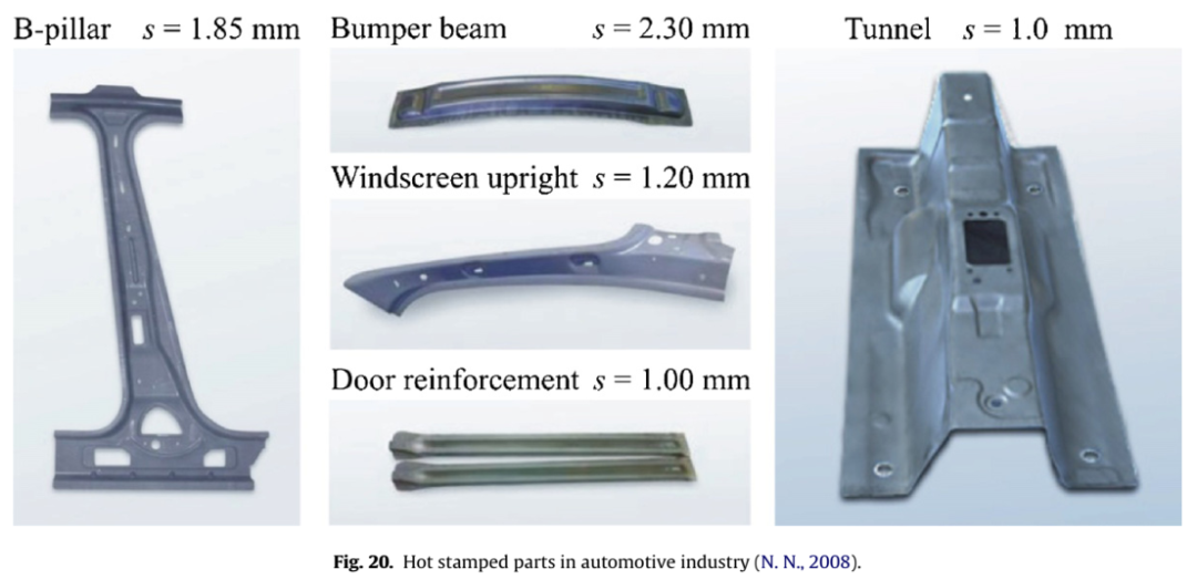 成形和硬化相結(jié)合使得22MnB5鋼在汽車行業(yè)成為理想的結(jié)構(gòu),尤其是在需要穿透性保護的機窗或者汽車上。一些汽車的A-柱和B-柱,邊緣沖擊保護,底梁,車架,保險桿,保險架,加固門柱,車頂框架,管道,后部和前部邊緣交叉部分(見圖20)。這些板的厚度變化在1.0和2.5mm之間。