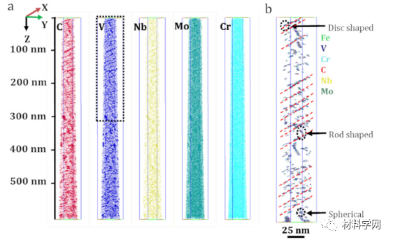 圖7 對MoCrNbV鋼進(jìn)行最大分離距離分析后,得到了(a)元素3d 原子探針圖和(b)探針體積中無規(guī)相和界面相析出物的放大分布(V 3D原子探針圖中以虛線矩形突出)。為了(b)的清晰度,去除了基質(zhì)子。分析的離子總數(shù)為44,237,826。