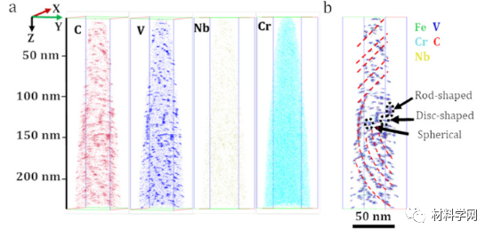圖8對VCrNb鋼進(jìn)行最大分離距離分析后,得到了(a)元素3d 原子探針圖和(b)探針體積中無規(guī)相和界面相析出物的放大分布。分析的離子總數(shù)為17,328,516。為了(b)的清晰度,去除了基質(zhì)子。