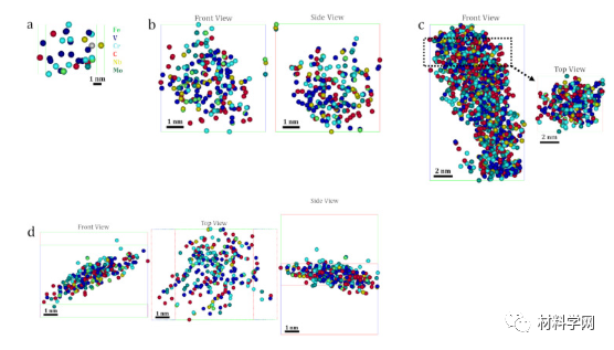 根據(jù)確定的臨界尺寸及其無序的原子排列,兩種鋼中的納米顆粒中都有析出了團(tuán)簇。這樣就可以估算出,團(tuán)簇大約可以提高150~170MPa的屈服強(qiáng)度。