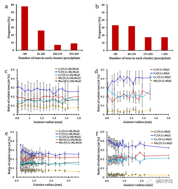 圖10  MoCrNbV (a,c,e) 和VCrNb (b,d,f)鋼中團(tuán)簇和碳化物(a,b)的尺寸分布及團(tuán)簇(c,d)和納米顆粒(e,f)組成的演變。