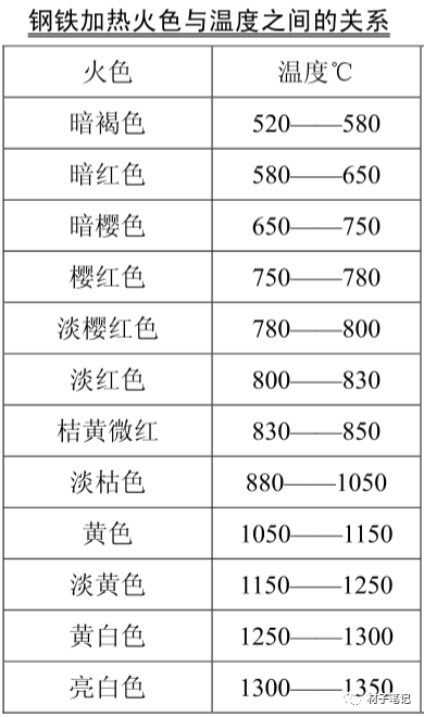 鋼在不同的溫度下具有不同的顏色,為了方便,前人總結(jié)了關(guān)于不同溫度和顏色的對(duì)照,方便在實(shí)際中的快速辨識(shí)。