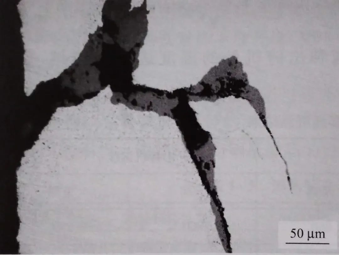從以上結果可以看出,帶有缺陷的鑄坯經高溫加熱和軋制后,由于沿缺陷縫隙內氧化的結果。在缺陷處形成由氧化鐵和密集分布的氧化圓點組成的氧化層,該氧化層在鋼基中似一夾層,在軋制時不能被軋合,遺留在鋼板表面便成為裂紋缺陷。