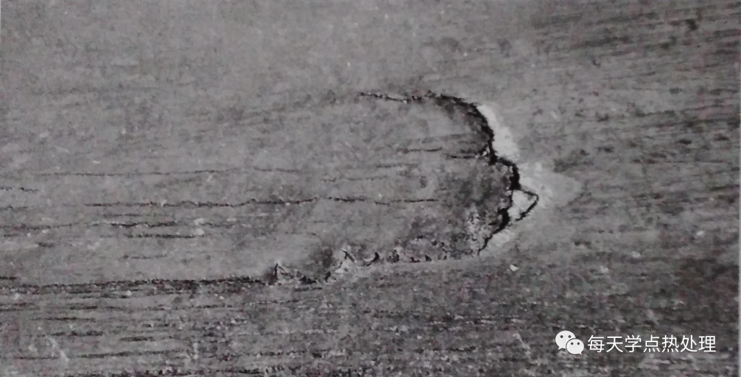 酸洗后,在板面缺陷部位又出現數量頗多且大小不一的“指甲”狀缺陷,缺陷裂口大出現在軋制方向前沿的一端,呈現出缺陷表面經軋制而流變的覆蓋層特征,另一端可隱約出邊界,見圖1-70。
