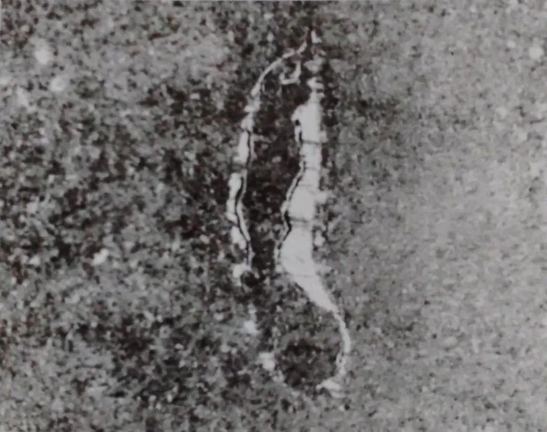 一批 SS400 板坯熱軋后在66個鋼卷上出現缺陷。缺陷產生在鋼板下表面,距邊部約300mm, 沿軋制方向呈周期性分布,間距約3.2m。缺陷呈彎月形,頗像結疤,尺寸約為15mm×3.3mm, 宏觀形貌見圖1-72。
