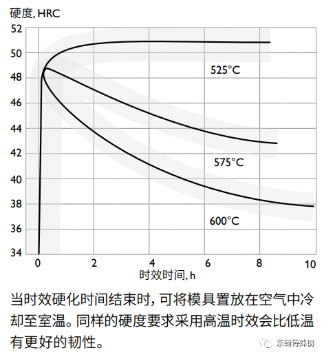 Corrax 可直接使用供貨態(tài)。更高的使用硬度可通過時效硬化來達成。下圖所示為獲得所需硬度,時效硬化溫度及時間的推薦。時效硬化時間就是當(dāng)模具完全熱透后在時效硬化溫度所持續(xù)的時間。