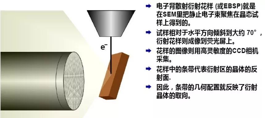 在掃描電子顯微鏡中得到一張電子背散射衍射花樣的基本操作是簡單的。相對于入射電子束,樣品被高角度傾斜,以便背散射