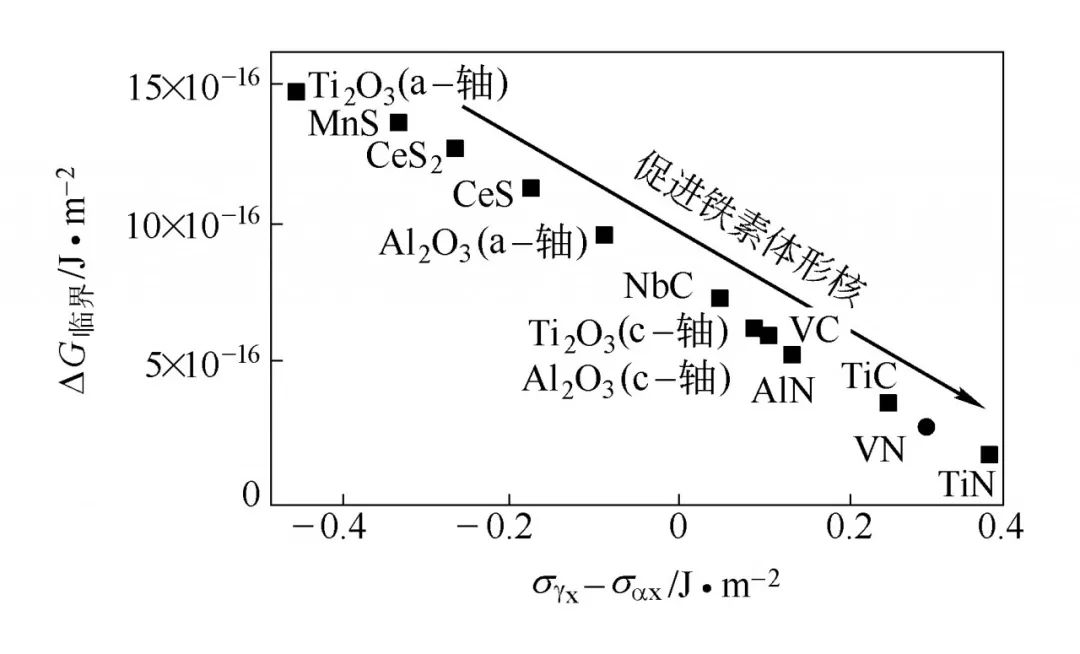 3  不同析出物(夾雜物)與鐵素體之間的界面能對形核驅動力的影響