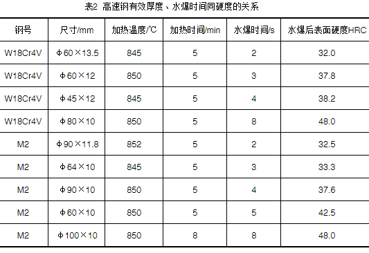 實施水爆工藝,要求坯料最好是同爐號,嚴格控制加熱溫度和水爆時間。同爐號料成分一致、相變相同,水爆后硬度基本相同;加熱溫度高溶入奧氏體的碳化物就多,水爆后硬度就高,加熱溫度低水爆后硬度不足;水爆時間以2~4s為宜。水爆時間越長,硬度越高。表2為W18、M2鋼不同尺寸水爆時間同硬度的關系。