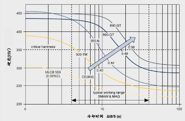 圖3顯示了焊接后從800°C到500°C的冷卻時(shí)間(ΔT8/5)對(duì)焊縫熱影響區(qū)(HAZ)性能的強(qiáng)烈影響。盡管在非常短的冷卻時(shí)間內(nèi)碳含量控制著了馬氏體的硬度,但碳當(dāng)量(CE)決定了冷卻過程中何時(shí)形成馬氏體。隨著CE的增加,臨界ΔT8/5會(huì)變長,并處于板材現(xiàn)場(chǎng)焊接所用的SMAW和MAG焊接工藝典型的工作條件范圍內(nèi)。CE較高的鋼種需要特殊的焊接預(yù)防措施,包括對(duì)焊接區(qū)域進(jìn)行預(yù)熱。隨著CE的增加,工藝處理窗口變窄(圖4)。焊接熱輸入過多會(huì)降低強(qiáng)度和韌性,而熱輸入過少會(huì)導(dǎo)致硬度過高,并增加熱影響區(qū)的冷裂風(fēng)險(xiǎn)。