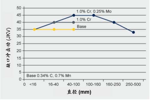 添加1%Cr使屈服強度提高了大約50%,再添加0.25%的Mo進一步提高了強度,且完全硬化部分直徑從100mm延長到500mm。