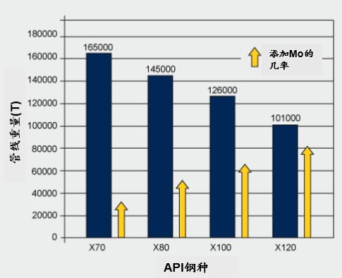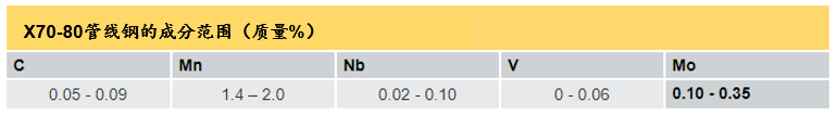 中國已建成的第二條西氣東輸油氣管道橫跨近5000公里,大規模采用了具有針狀鐵素體金相組織的X80級管線鋼。 大部分管線采用熱軋厚(18.4 mm)鋼帶制成的螺旋焊管。 管道材料為低C(<0.07%)、含Nb(0.07-0.10%)和Mo(0.2-0.3%)鋼。 即使合金含量很低,最終的成品管道也含有大約10,000噸的鉬。