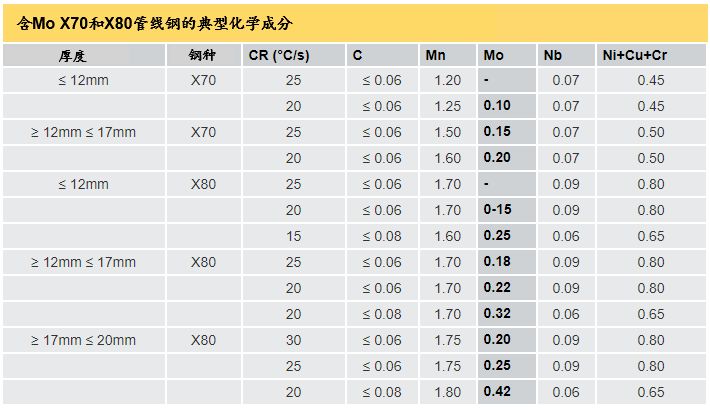 然而,由于許多軋鋼廠終軋后無法采用所要求的冷卻速度,甚至沒有所需要的加速冷卻設備,唯一可行的解決方案是選用合金元素如Mo來獲得所希望的材料性能(見表1 和2)。并且,隨著X70成為現代管線項目的材料主力和螺旋焊管的日益普及,在過去的幾年中,對爐卷軋機(Steckel軋機)或傳統的帶鋼熱軋機(HSM)所生產的高性價比厚鋼板和熱軋卷的需求顯著增長。因此,許多鋼廠為滿足當今日益增長的管線需求,重新引入并利用1970年代取得的冶金學成果,采用鉬合金化。