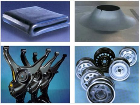 通常的Mo合金化HSLA鋼表現出優異的冷成形性能,下圖為測試樣品表現及利用了上述優良性能的汽車部件。其中左上為多次彎曲(“手帕”)測試, 右上為擴孔試驗。左下為高度變形的懸架臂, 右下為成型車輪。