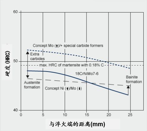 圖1顯示了鋼的成分改進對C含量為0.18%的滲碳鋼(18CrNiMo7-6)淬透性的影響。添加碳化物形成元素的強大效果是顯而易見的。圖中實線表示對照鋼的淬透性。提高Ni含量和降低Mo含量(底部虛線)促進了貝氏體的形成,增加了核心部分的韌性,但由于提高了滲碳后殘余奧氏體的比例,所以表面外殼的硬度降低。Mo和特殊的碳化物形成元素(頂部虛線)的組合均勻地提高了部件的硬度,并且將表面硬度提高到 0.18%C鋼(虛線)的基本硬度以上。