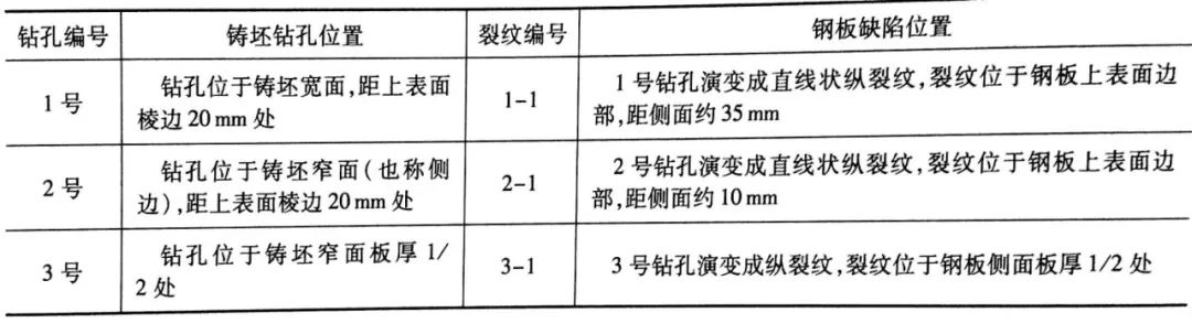 為驗證以上判斷,找出鑄坯缺陷與熱軋鋼板邊部缺陷的對應關系,在Q345C 鑄坯試樣上做預制裂紋鉆孔試驗,孔徑均為Φ10mm, 孔深為20mm。鉆孔后的鑄坯按相同工藝熱軋成22mm 厚的鋼板。鑄坯鉆孔與鋼板缺陷的對應關系見表1-3。