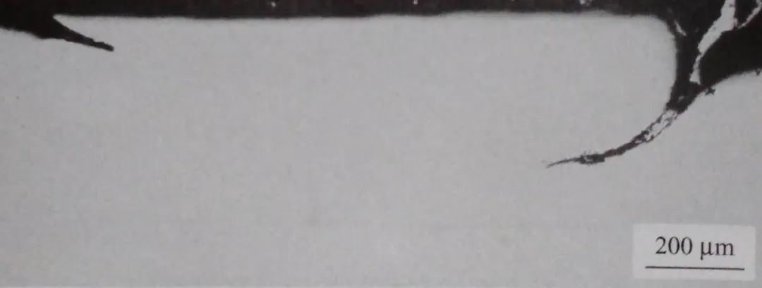 用金相顯微鏡觀察鋼板縱截面試樣,裂紋分布在試樣表層,多呈樹枝狀沿變形最大方向擴展,裂紋處除氧化鐵外,還存在大量聚集分布的灰色顆粒狀夾雜物,見圖1-18和圖1-19。