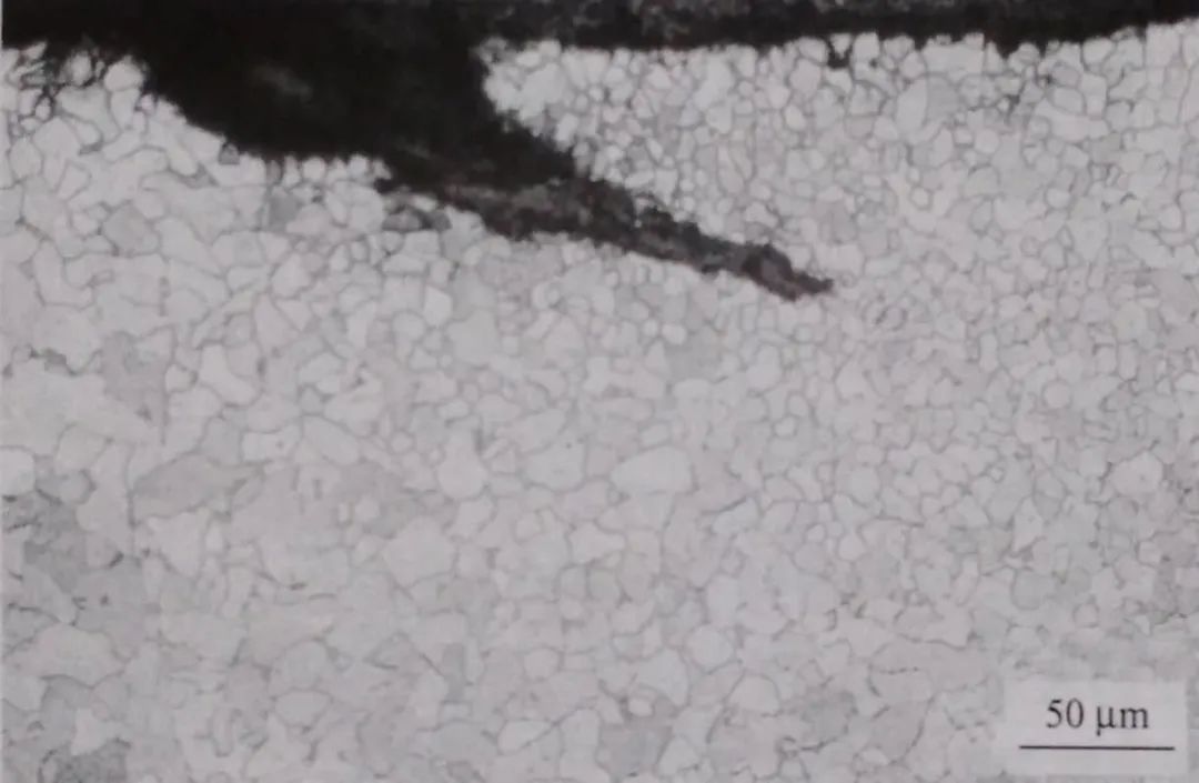 裂紋在鋼板縱截面表層呈雙條對稱分布、附近無高溫氧化特征,見圖1-39。經試劑浸蝕后,試樣正常部位組織為鐵素體和少量三次滲碳體、晶粒度為10級,裂紋兩側的晶粒存在差異,一側晶粒較細,晶粒度為11級:另一側晶粒與正常部位基本相同、晶粒度為9. 5級,見圖1-40。
