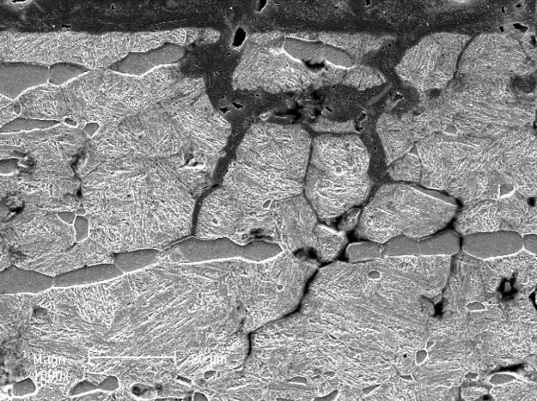 (2)斷裂的S43100不銹鋼螺栓斷口為典型的沿晶斷裂特征。